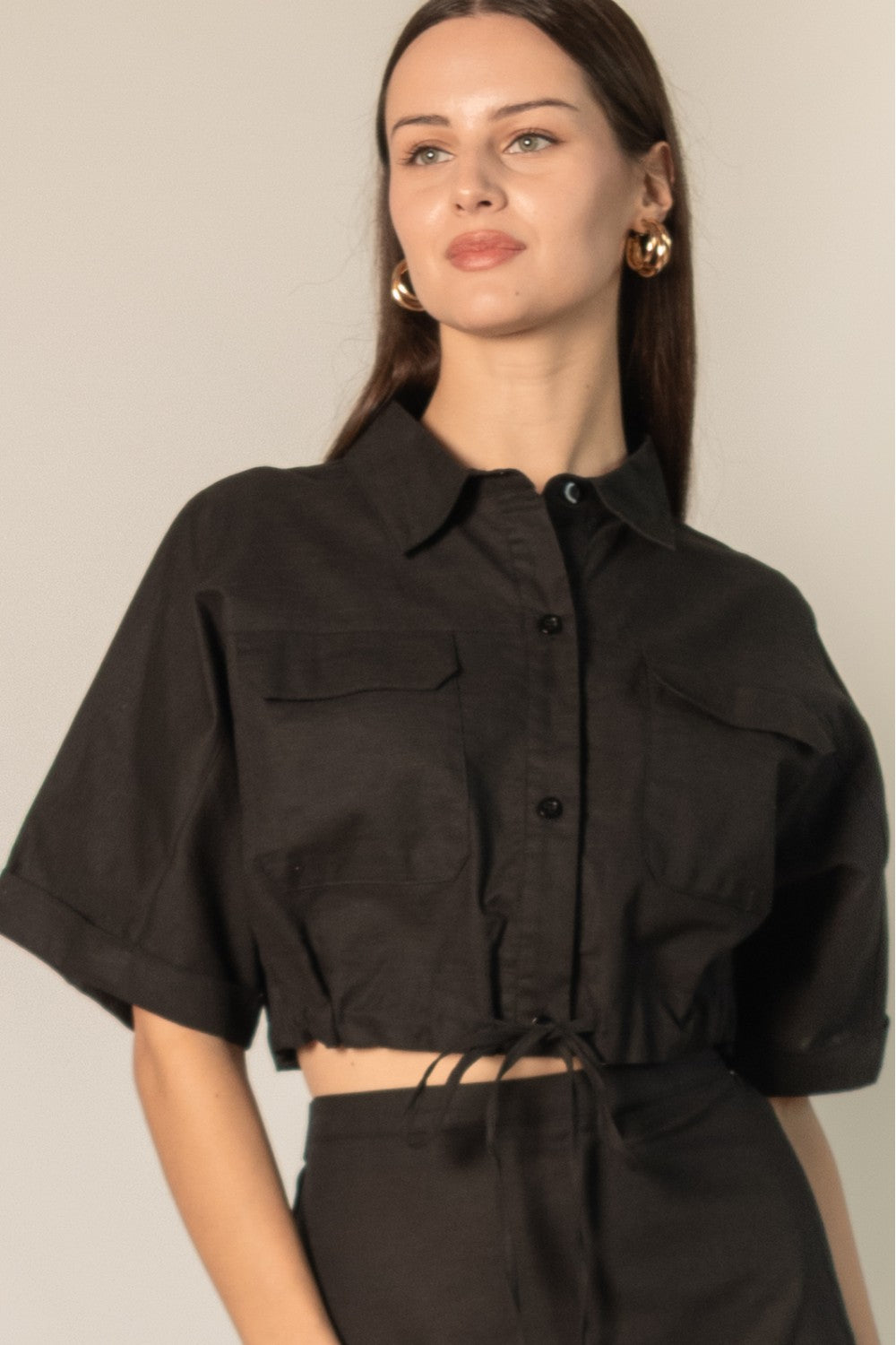 Effortlessly cool with a touch of everyday chic — the Utility Crop Top is a must-have for your fall wardrobe. Made from a breathable linen and cotton blend, it features a relaxed fit with a drawstring hem that lets you customize your silhouette. Front cargo pockets add a modern, utility-inspired touch while keeping things functional and stylish. Designed true to size with minimal stretch for that structured, polished look.
