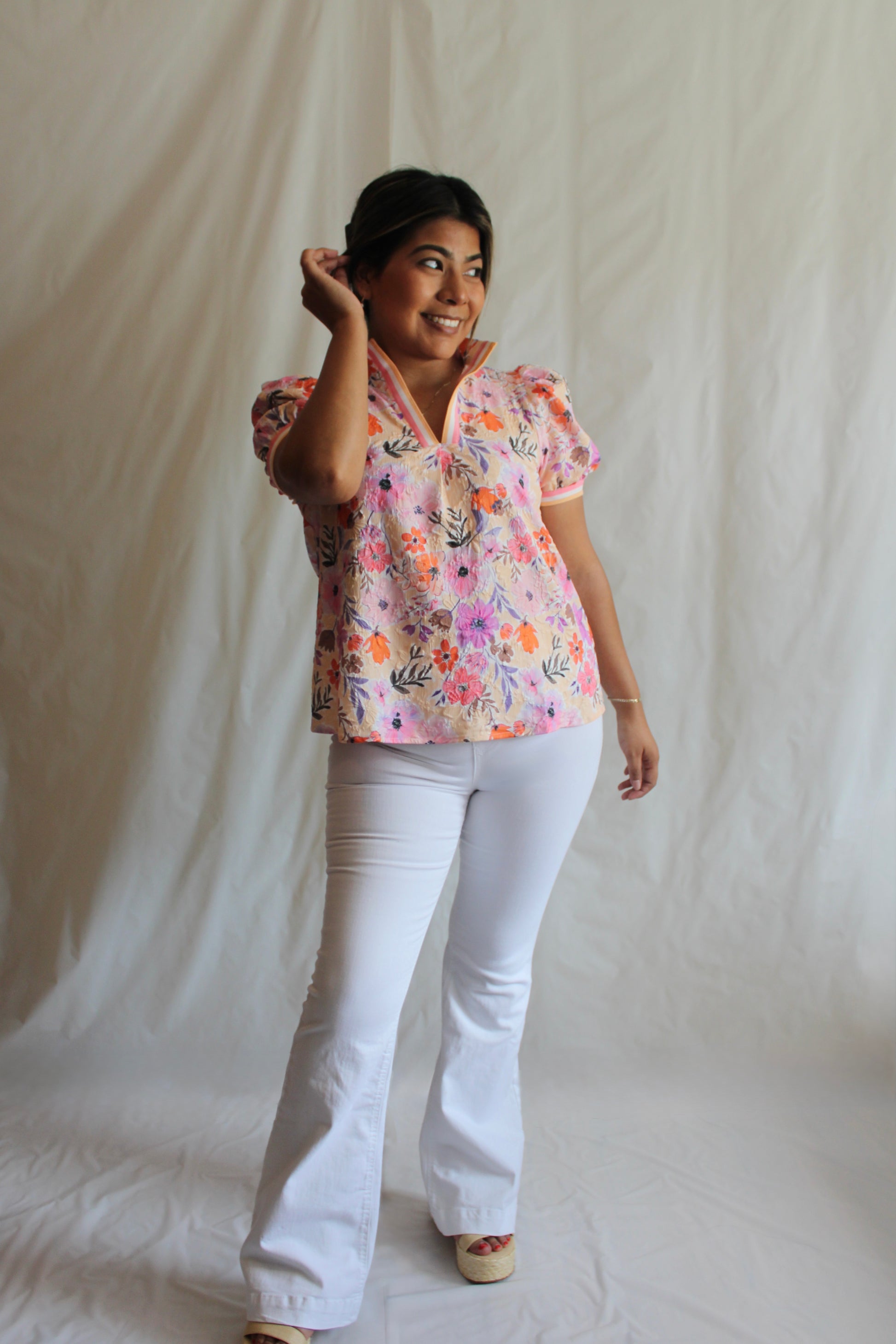 Sweet, feminine, and full of charm — the Winnie Top is the perfect blend of comfort and style. Featuring a delicate floral print and a flattering V-notch neckline with contrasting trim, this top brings a pop of personality to your wardrobe. The puff sleeves with elastic trim add a soft, romantic touch while keeping the fit comfortable and easy to wear. Designed true to size with minimal stretch, it’s a versatile piece for every season.